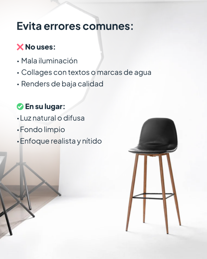 En categorías como muebles, hogar y decoración, el contexto visual es determinante. Mostrar un producto en uso, por ejemplo, un sillón en una sala, un escritorio armado, una lámpara encendida, ayuda al usuario a imaginarlo en su espacio, aumentando la conexión emocional y la probabilidad de compra.