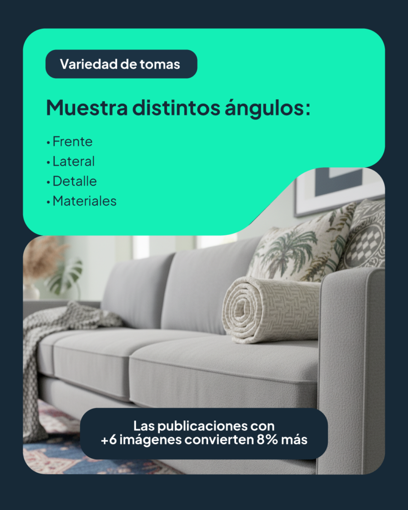 - Múltiples ángulos: muestra confianza cuando el comprador puede ver detalles, texturas y proporciones.